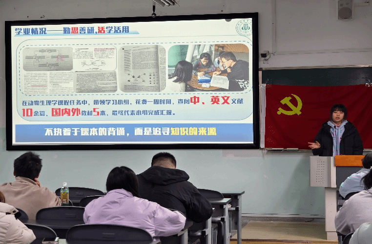 分享会上,喻琪媛从学业精进、科研探索、素质拓展等多个维度,立体呈现了一名卓越学子的成长图景。在学业方面,她系统阐述了“不执着于课本背诵,追寻知识来源”的学习理念,结合文献查阅方法、课程汇报技巧与英语能力提升策略,分享了一套具有可操作性的学习路径。在科研创新领域,她曾进入深圳湾实验室参与前沿课题研究、在“挑战杯”等多项学术竞赛中荣获省级金奖、银奖等荣誉,还作为学校唯一入营清华大学生命科学联合中心的学生。她特别强调“勇气比完美更重要”,鼓励同学们敢于尝试、在科研实践中持续成长。同时,她四次体测90分以上,曾获校体育文化节排球联赛女子组冠军与“最佳攻手”称号,曾担任学院团学兼职副书记、助力学院获评“五四红旗团委”,她用亲身经历向听众诠释了青年学子的责任与担当。