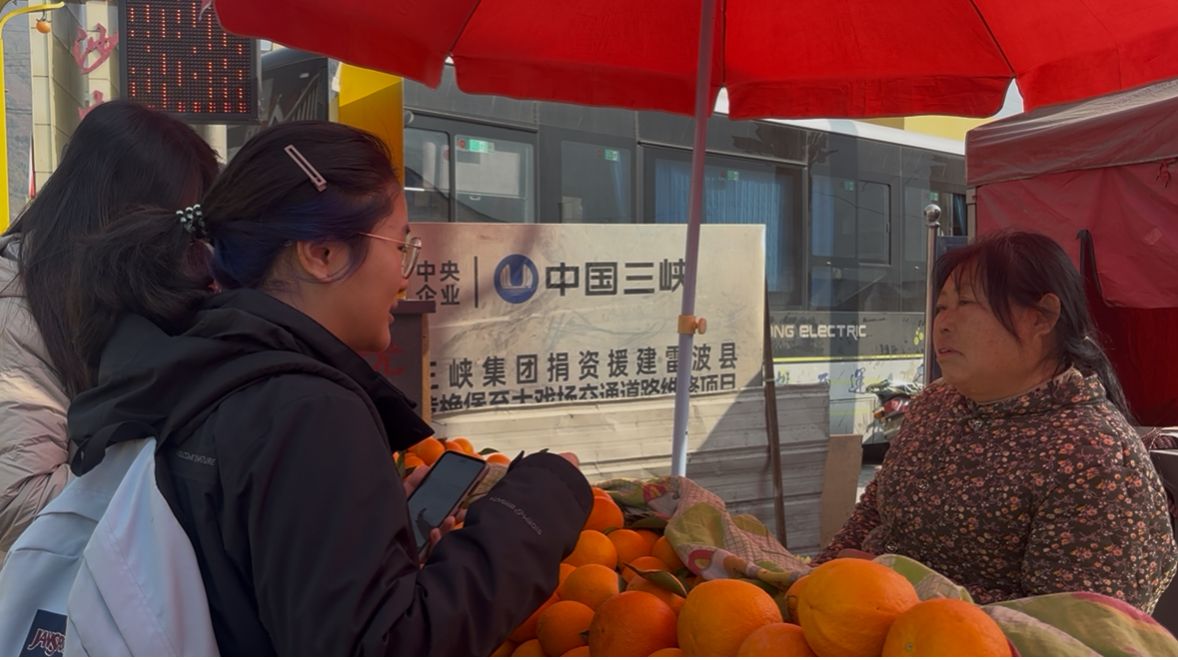告别村委会,团队沿蜿蜒公路走访沿途脐橙售卖点,30余份调研问卷在亲切交流中顺利完成。在与三十余户农户的访谈中我们了解到:去年因暖冬导致花期提前,年产量较前年下降了不少,但高产农户在精细管理下仍能实现每亩3000至4000公斤收成,稳固增收底线。优质果以5至6元/斤定价,主攻线下商超与线上订单;次果按2至4元/斤灵活售卖,供给本地集市实现“果尽其用”。得益于道路硬化与物流升级,快递上门采收取代了肩挑背扛,大幅降低运输损耗与人力成本,为雷波果农送来增收致富的“快车道”等等。