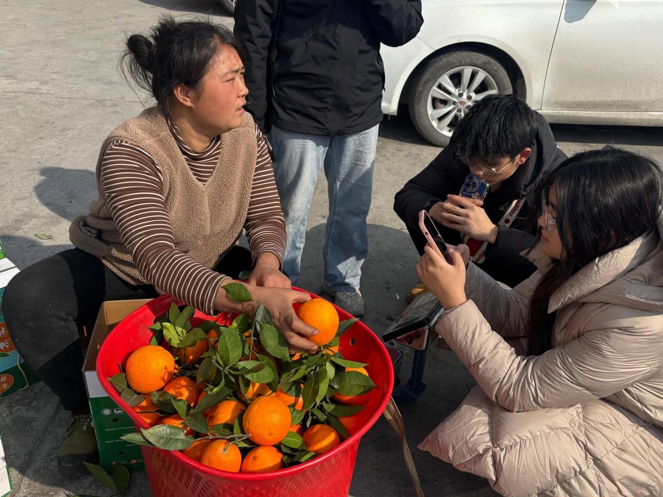 农户们的热情如冬日暖阳,瞬间驱散了山间寒意,得知团队是远道而来的川农学子,农户不仅耐心细致地回答了我们的每一个问题,还把最新鲜的脐橙招待大家。剥开果皮,清甜汁水迸发,这颗孕育于高山坡地与金沙江温润气候的果实,既承载着农户的增收希望,更凝聚着金沙村人战天斗地的坚韧品格。