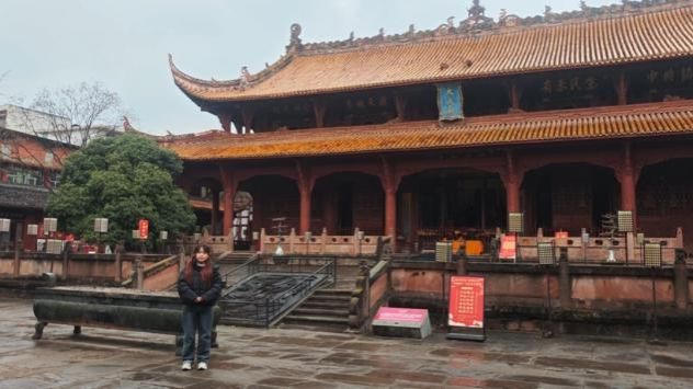 走进德阳孔庙,实践队队员阳慧玲在棂星门与大成殿之间驻足流连。她将目光投向了儒学精神的当代“活化”实践——从孔子像前的礼仪展示到青少年研学活动的文化体验,从传统经典与地方文化的融合到新时代语境下的价值阐释。在这片穿越千年的儒学圣地,她深刻体悟到文化传承“守正创新”的真谛:既要在根脉中汲取养分,也要在时代中焕发新生。