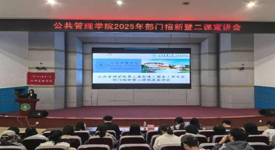 为丰富2025级新生的大学生活,帮助同学们深入了解第二课堂成绩单制度,学院第三届学生党建·团委·学生会招新暨二课制度宣讲会于10月12日上午在逸夫楼小礼堂顺利开展,学院第三届主席团成员、各部门负责人及2025级全体新生参加会议。