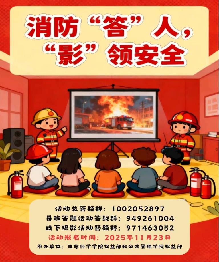 为迎接全国消防日,积极响应“全民消防,生命至上”主题号召,11月25日至27日,四川农业大学公共管理学院与生命科学学院学生会权益部联合举办“消防‘答’人,‘影’领安全”十一月主题权益日活动。活动采取“线上答题+线下观影”相结合的形式,面向两院全体学生普及消防安全知识,有效增强了学生的安全防范意识与应急处置能力。