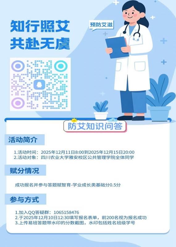 为普及艾滋病防治知识,增强青少年自我防护意识,12月11日至16日,公共管理学院学生权益部面向全院学生组织开展了“知行照艾,共赴无虞”防艾知识线上竞答活动。本次活动通过易班平台进行,吸引了众多同学积极参与。